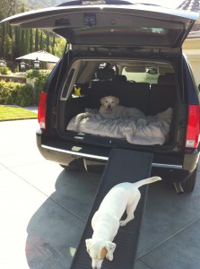 The dogs sit in the Escalade all day long while I work on my computer in my house. They like the shade and the memory foam mattress in the back. They sit there all day and check out the birds and the gophers destroying my grass. Trey refuses to get out, the gardeners even came this morning and both Kaylee and Trey barked at them from inside the Escalade! Geez, they are spoiled dogs.